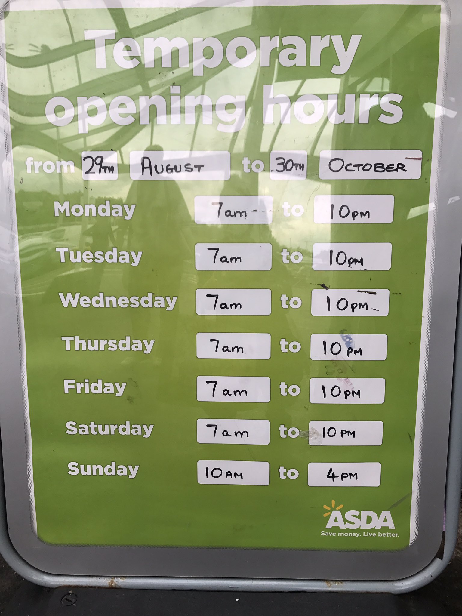 Asda Opening Times Today - Sign showing opening hours and times for Asda super store ... : Today (sunday), its opening hours are from 8:00 am until 8:00 pm.